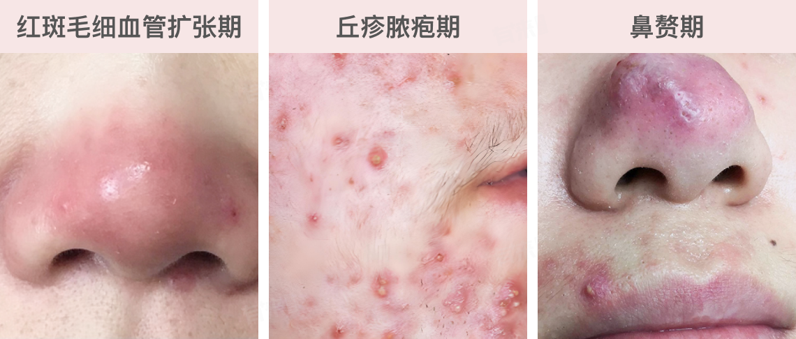 多见于男性,这是玫瑰痤疮比较严重的一个阶段,主要表现为鼻尖部的皮肤增生、肥厚,形成大小不等的结节状隆起。鼻赘的形状不规则,有的像肿瘤一样,质地比较硬,颜色一般是暗红色。这个阶段,患者的鼻子外形会发生明显的改变,变得肥大、臃肿,严重影响面部美观。