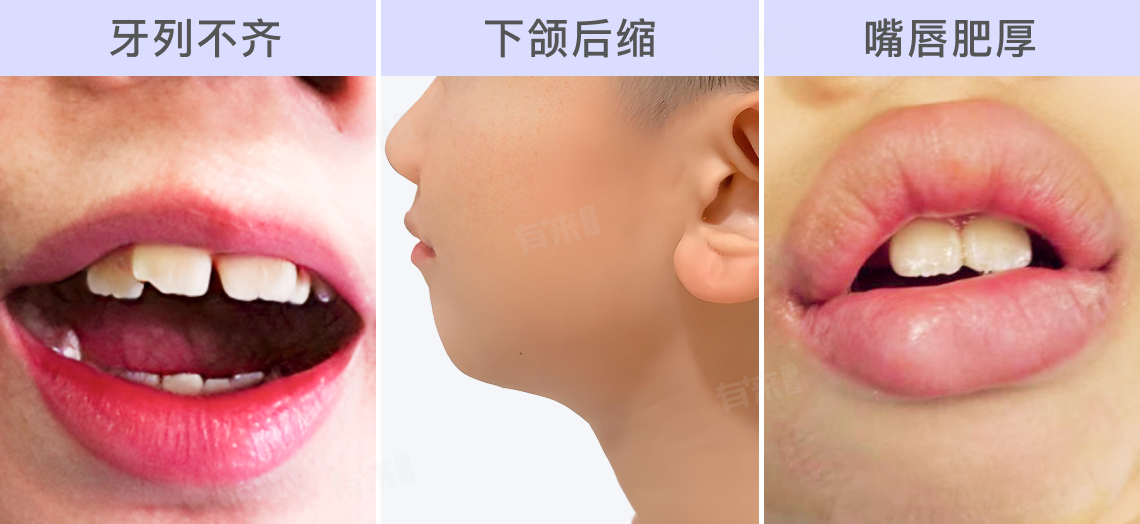 7、腺样体面容:腺样体肥大患儿长时间的用嘴呼吸,容易形成特殊面容,表现为牙列不齐、下颌后缩、嘴唇肥厚等。