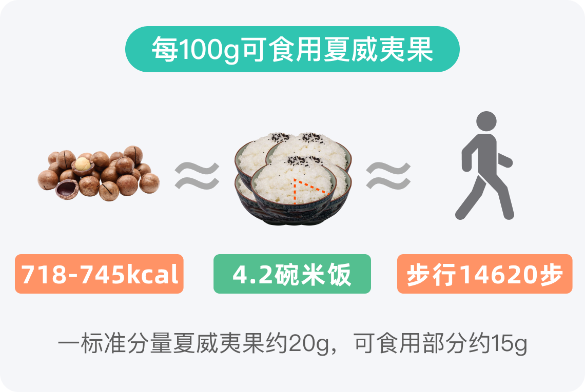 一标准分量夏威夷果约20g,可食用部分约15g。以每100g夏威夷果含有731kcal热量进行计算,一标准分量的夏威夷果,其热量大约为109kcal。这相当于0.6碗米饭的热量。这里米饭的热量为116kcal/100g,一碗米饭约150g。