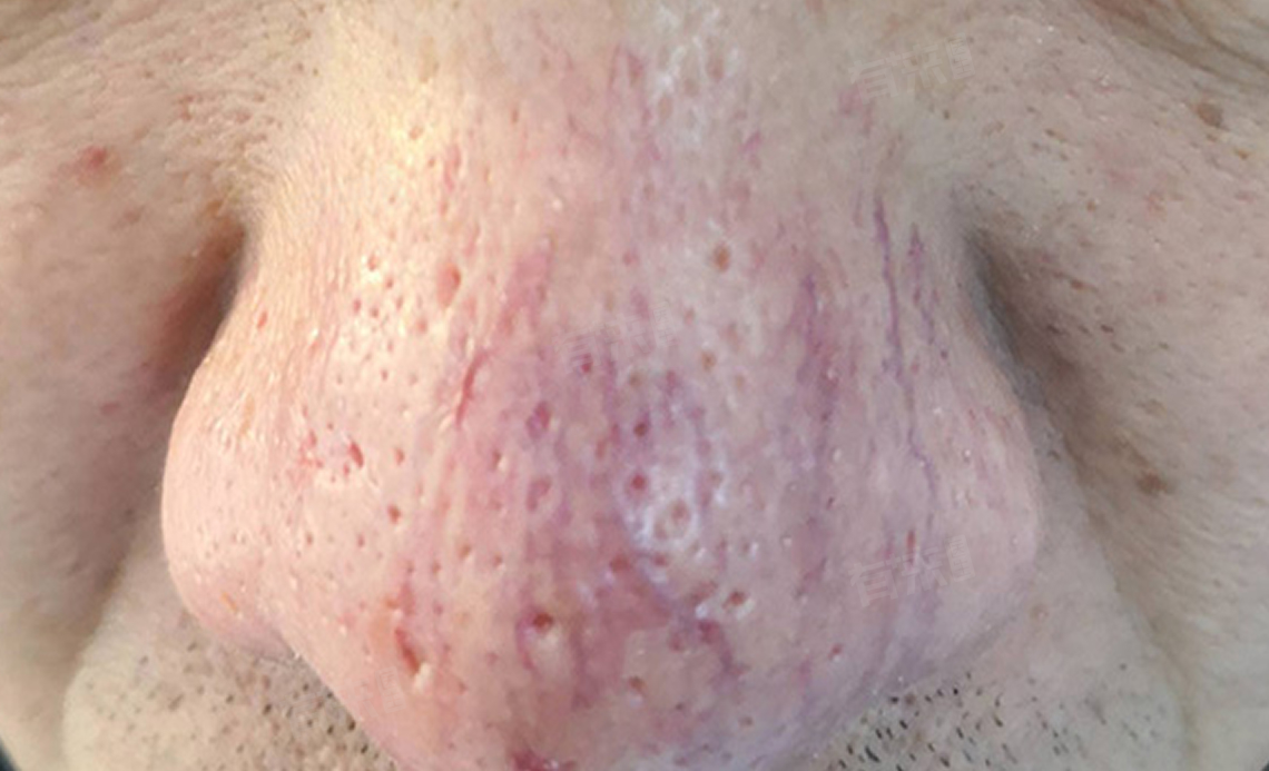 其表面凹凸不平,毛囊口明显扩大,皮脂分泌旺盛,毛细血管显著扩张。从红斑期发展至鼻赘期通常需要数十年。