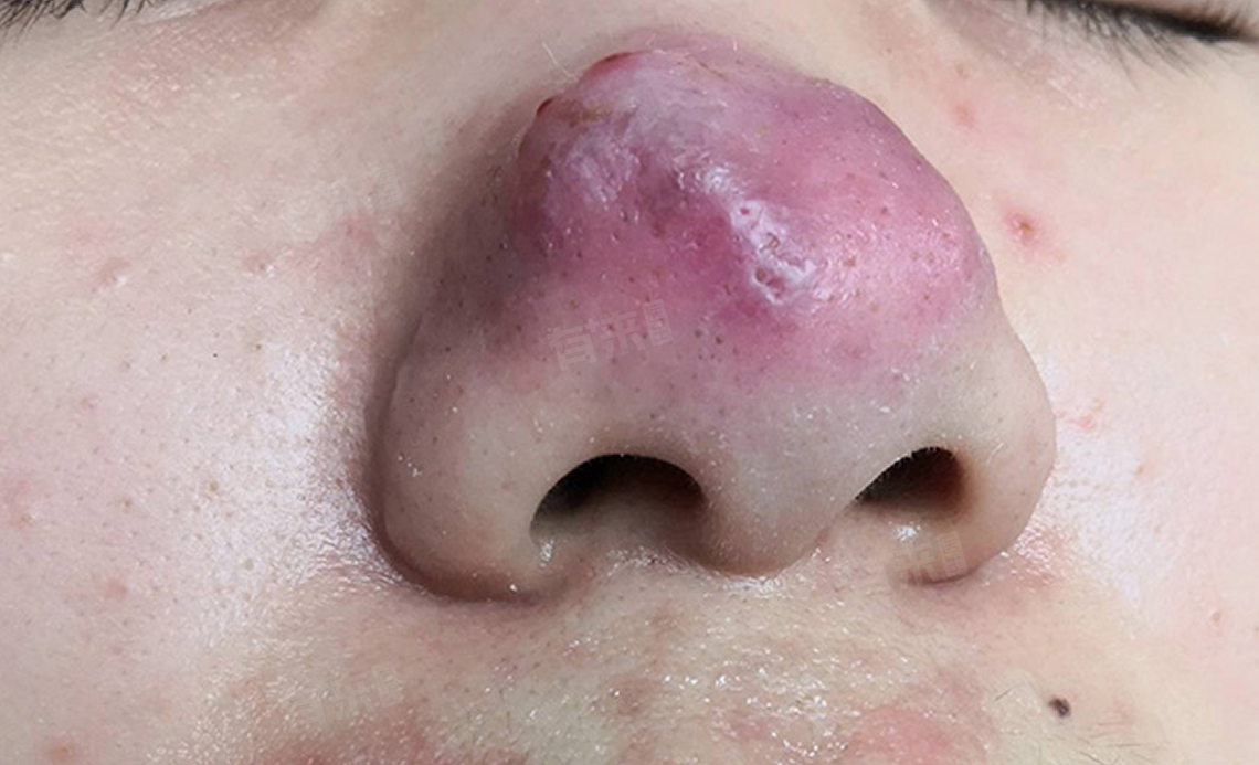 病期长久者鼻部皮脂腺及结缔组织增生,致使鼻尖部肥大,形成大小不等的紫红色结节状隆起,称为鼻赘。
