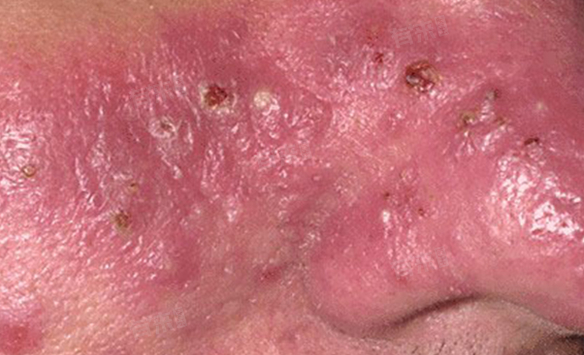 在红斑基础上成批出现针头至绿豆大小丘疹、脓疱、结节,毛细血管扩张更为明显,纵横交错,鼻部、面颊部毛囊口扩大明显。皮损时轻时重,常此起彼伏,可持续数年或更久。