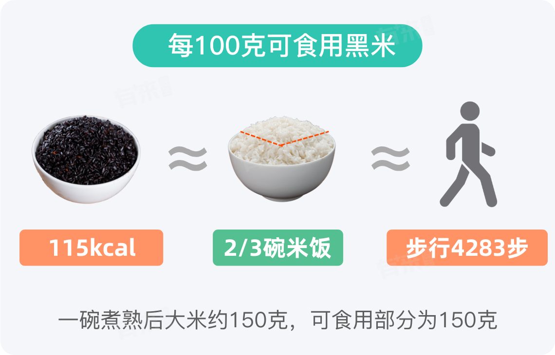 煮熟后的黑米的热量每100g约为115kcal,等于2/3碗熟米饭的热量,以及走路4283步所消耗的热量。实际消耗时间因个体体重、运动强度而异,但可作为一般参考。