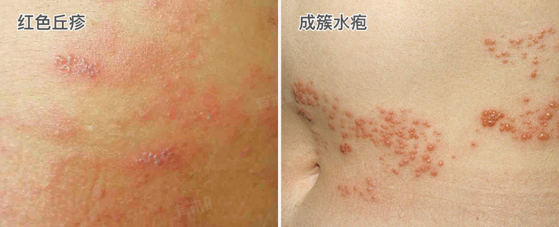 - 水疱排列紧密,呈现出带状或条索状分布,各个水疱之间界限分明,如同串珠一样排列。除水疱外,还可能出现丘疹,丘疹一般为红色,稍高于皮肤表面,是水疱出现前的早期形态。