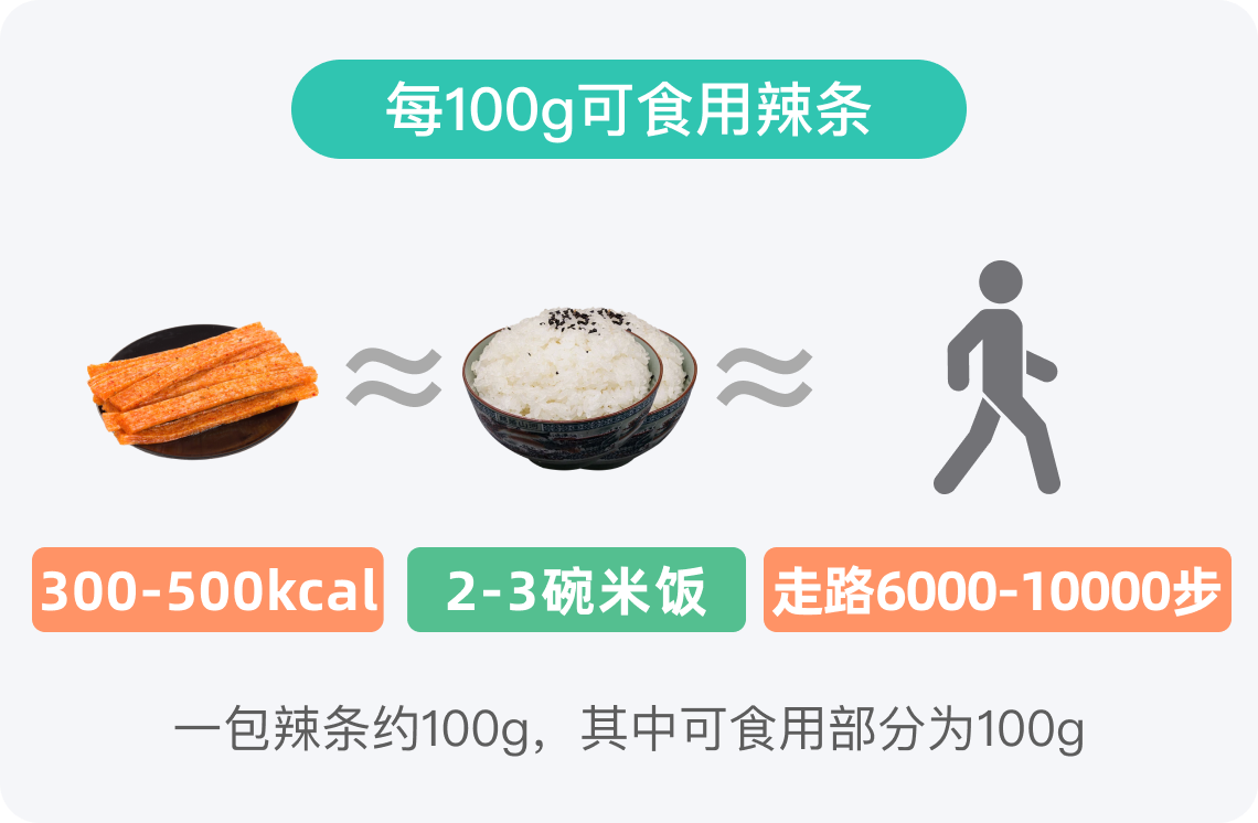 营养学上认为,高热量食物是指每100g热量高于200kcal,所以辣条属于高热量食物。一包辣条约100g,食用后所产生的热量在300-500kcal,相当于2-3碗熟米饭的热量。若以一餐占比热量计算,假设一个成年人每日所需热量为2000kcal,100g辣条所含的热量约占全天所需热量的15%~25%。