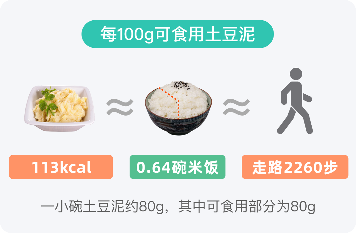 一小碗土豆泥约80g,食用后所产生的热量为90kcal,相当于半碗熟米饭的热量。从运动消耗量的角度来看,消耗90kcal的热量可能需要快走20分钟。