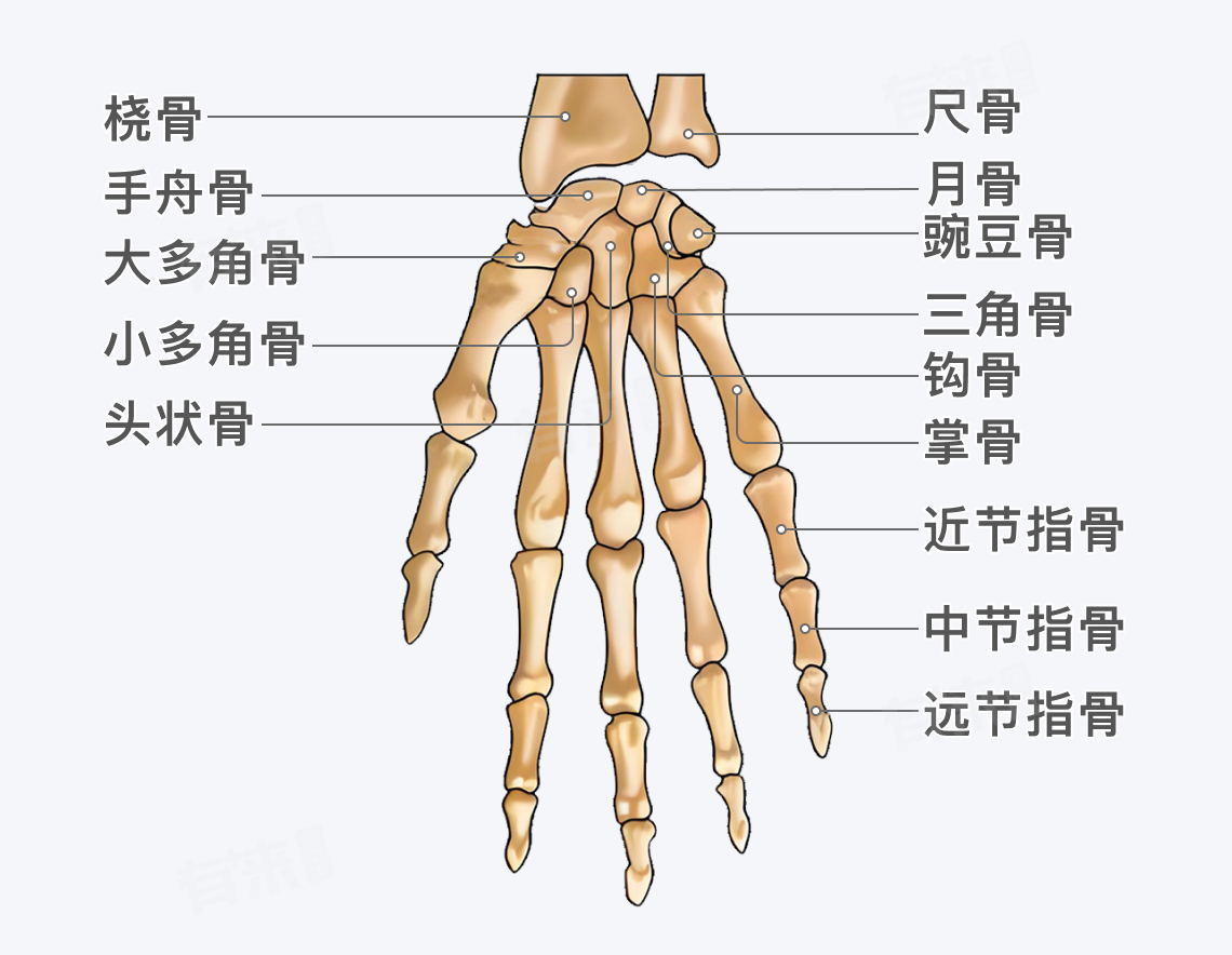1、腕骨:共8块,分别是手舟骨、手月骨、手三角骨、手豌豆骨、手大多角骨、手小多角骨、头状骨和钩骨。它们排成近、远二列,并与韧带连结成一整体。