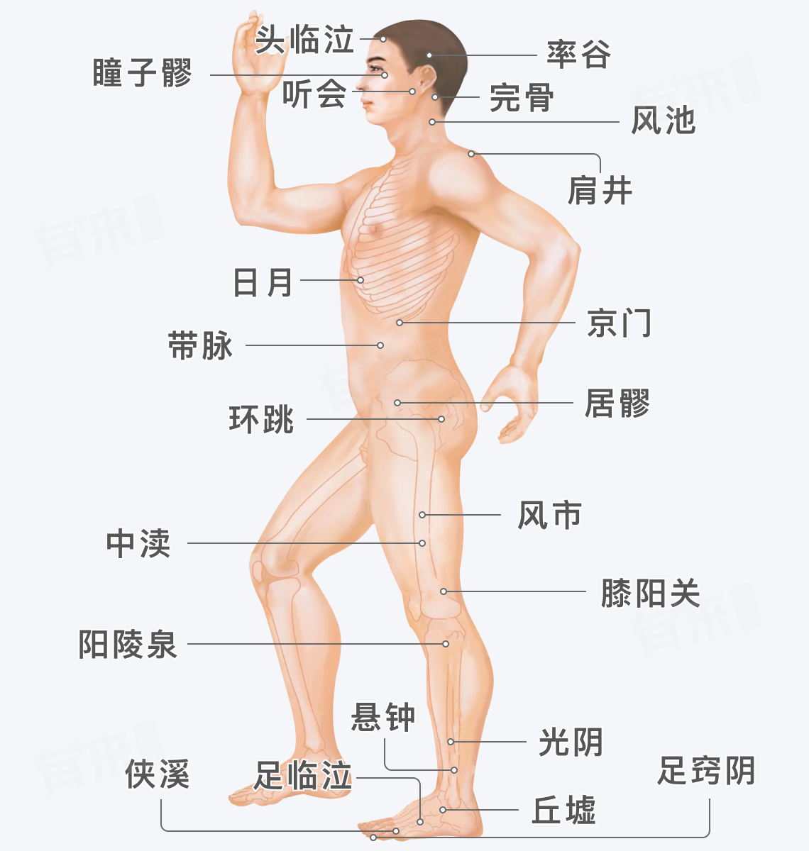 足少阳胆经分布于人体头侧面、胸腹侧面、下肢外侧中部及第4趾,循行44个穴位,首穴为瞳子髎,起始于外眼角,沿人体耳、头、颈及肢体两侧向下,经足外踝抵于足部第4趾外侧的足窍阴穴。具有调节气血、疏肝解郁、促进消化、缓解疼痛、改善情绪等作用。