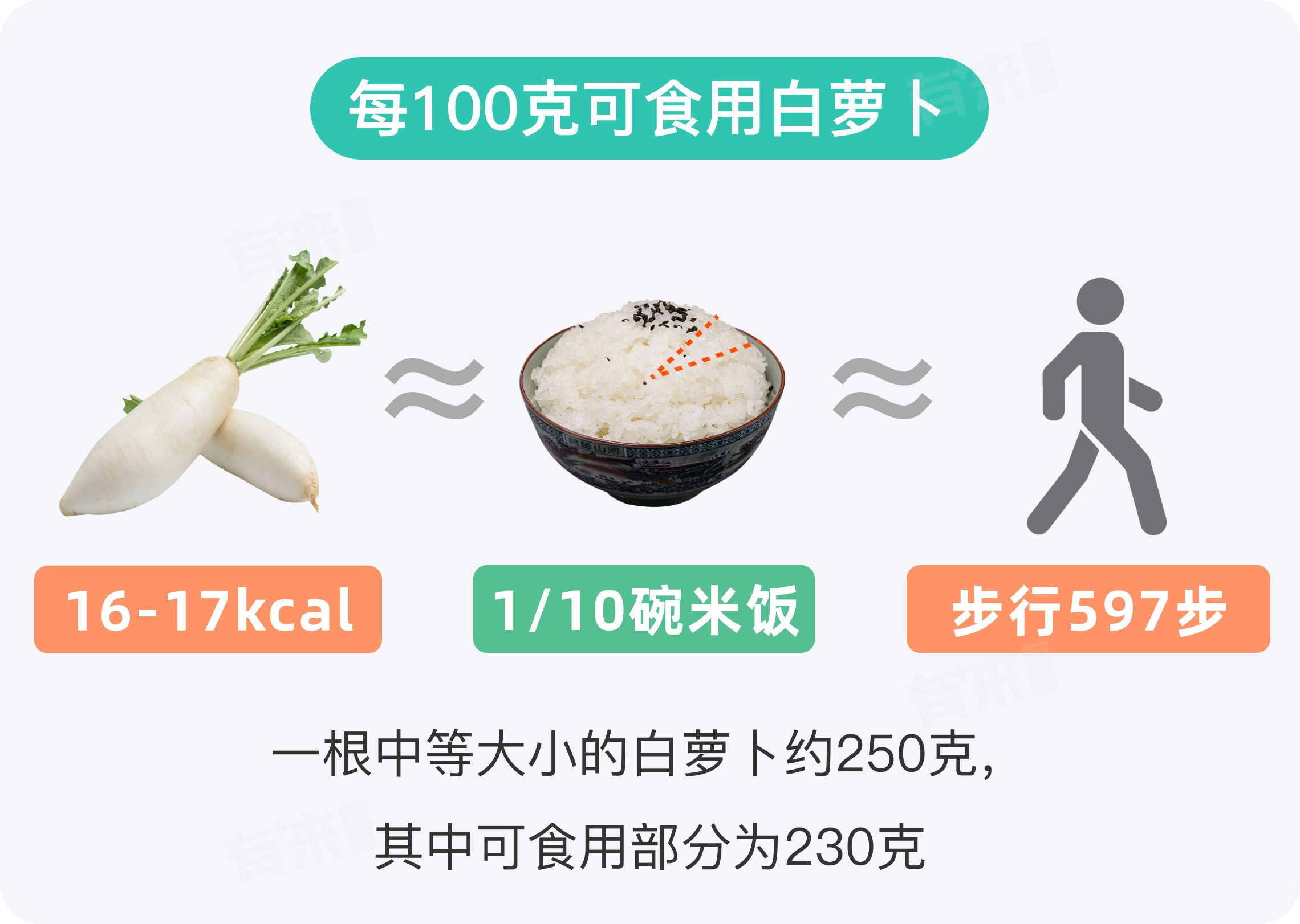 一个白萝卜大约为500g,可食用部分为480g,热量约为80kcal,相当于1/2碗150g米饭的热量,这个热量水平明显低于部分成年人一餐所需的热量。
