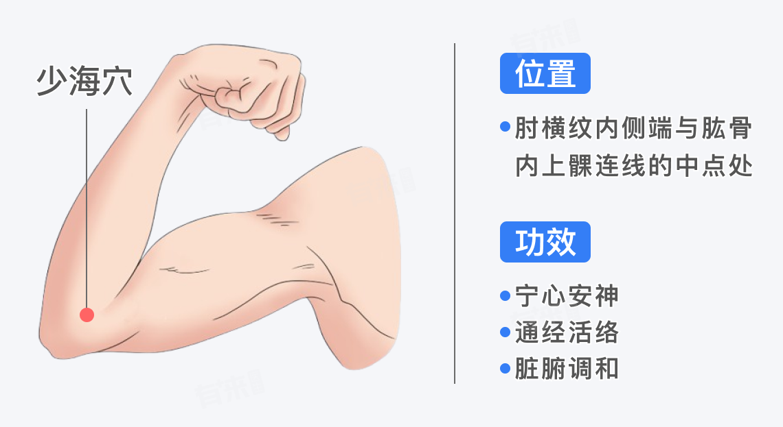 少海穴位于胳膊内侧,具有宁心安神、通经活络、脏腑调和的功效,主治失眠、焦虑症、上肢疼痛、心悸等病症。