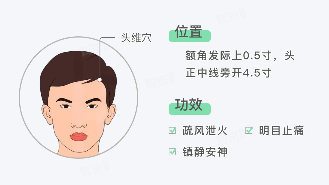 头维穴属于足阳明胃经,位于额角发际上0.5寸,头正中线旁开4.5寸,正坐或仰靠、仰卧姿势比较便于找到。头维穴具有疏风泄火、明目止痛、镇静安神等功效。