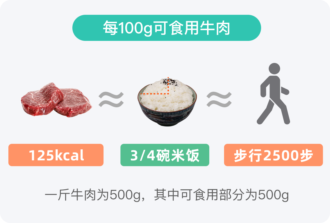牛肉的可食用部分几乎为100%,一份500g的牛肉约625kcal,等于3.6碗白米饭。对于大部分成年人,此热量在一餐中所占比例偏高,因此应注意适当控制摄入量。