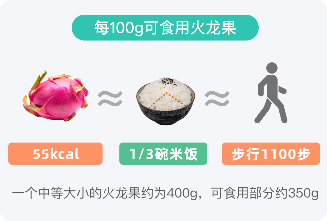 火龙果属于低热量食物,每100g可食用火龙果的热量约为55kcal,一个中等大小的火龙果可食用部分约350g,其热量约为192.5kcal,热量来源于碳水化合物。火龙果有助于提供饱腹感,一般成年人每天食用100-200g的火龙果比较合适。