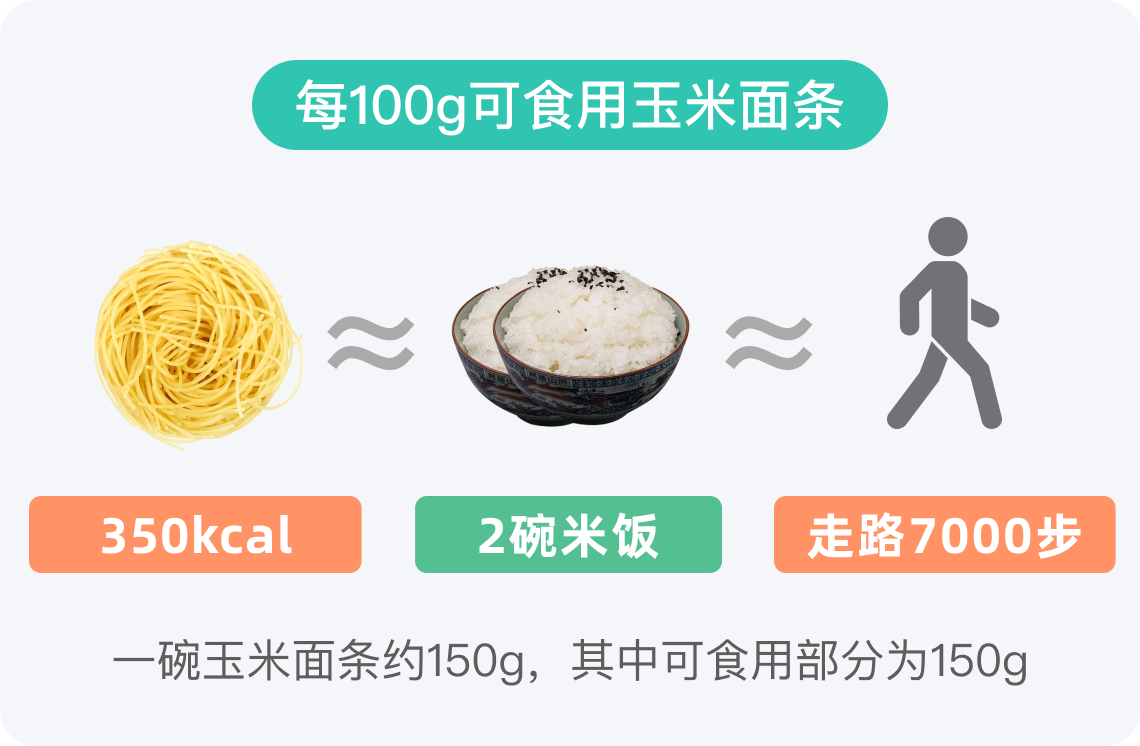 一碗玉米面条约150g,食用后所产生的热量为525kcal,相当于是3碗熟米饭的热量,所以对于有控制热量需求,或者是减肥人士而言,都不宜过多食用。