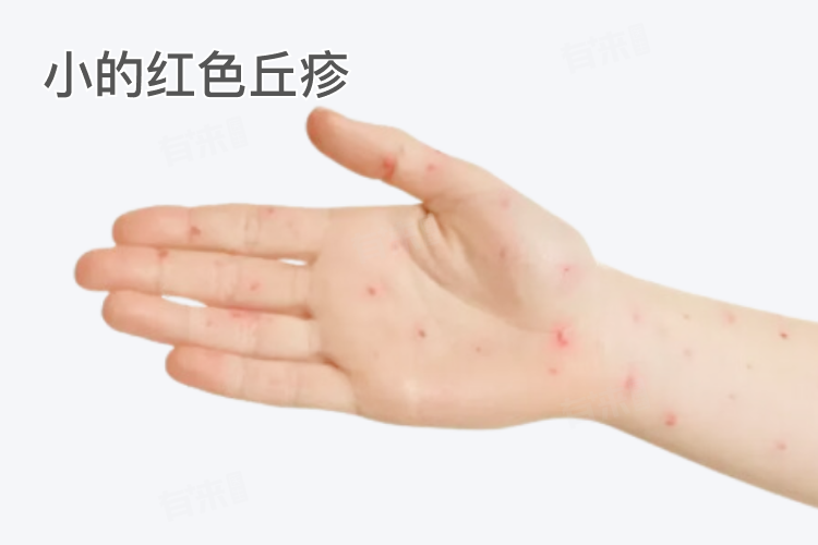 1、丘疹:猴痘初起时,多为小的红色丘疹,分布范围广泛,不仅限于某一部位,而是可出现在面部、四肢、躯干等多个部位,且多呈对称性分布。丘疹出现前及发展过程中,患者常伴有发热、头痛、肌肉酸痛、关节疼痛、淋巴结肿大等全身症状。