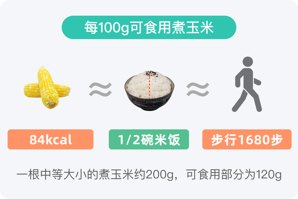 一个200g的煮玉米,可食用部分约为120g,热量约100.8kcal,相当于4/7碗米饭。对于成年人一餐500-800kcal的热量需求而言,煮玉米所占热量比例较低,是一种较为合适的食物选择,既能提供一定能量,又不会造成热量摄入过多。