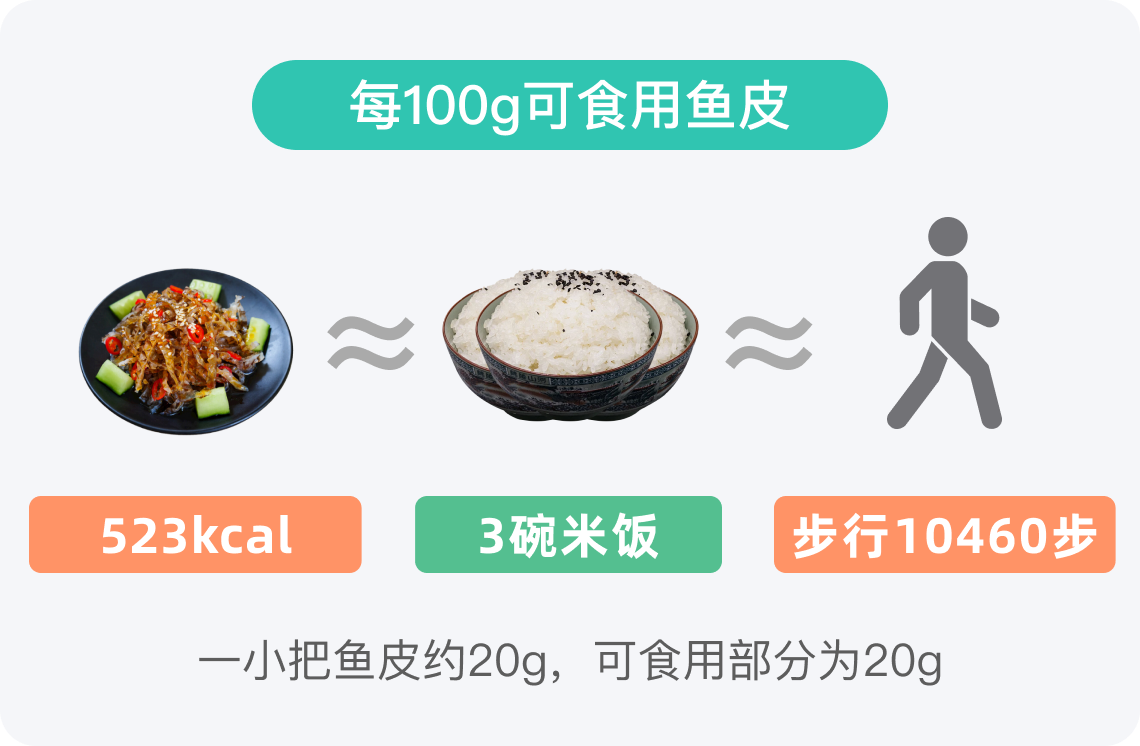 100g鱼皮热量为523kcal,一小把可食用部分约20g的鱼皮热量为105kcal,这相当于约3/5碗米饭。在成人一餐中,如果总热量摄入为600-800kcal,20g鱼皮的热量占比13%-17%。