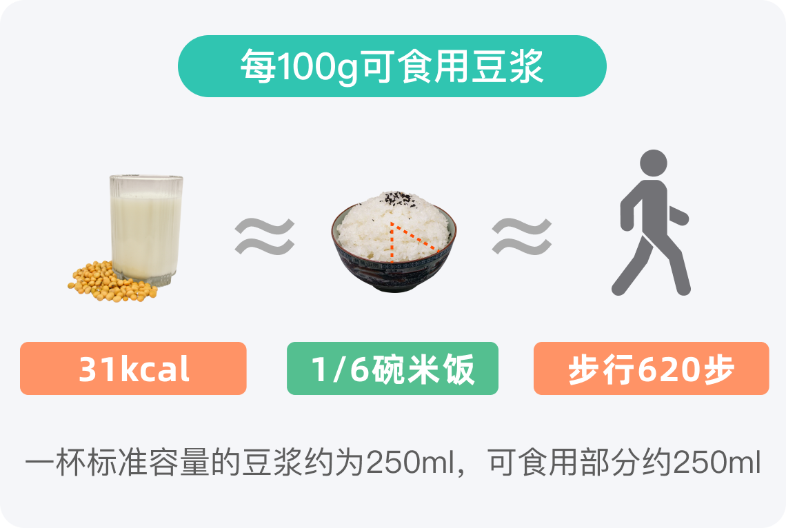豆浆属于低热量食物,每100g可食用豆浆的热量约为31kcal,一杯标准容量的豆浆可食用部分约250ml,其可以产生约77.5kcal的热量。豆浆富含维生素及钙、铁、锌等多种矿物元素,以及优质植物蛋白和氨基酸,适合大多数人群食用,尤其适合营养不良者、血脂、血糖偏高者等,健康成年人建议每天饮用1-2杯豆浆,注意不要过量。