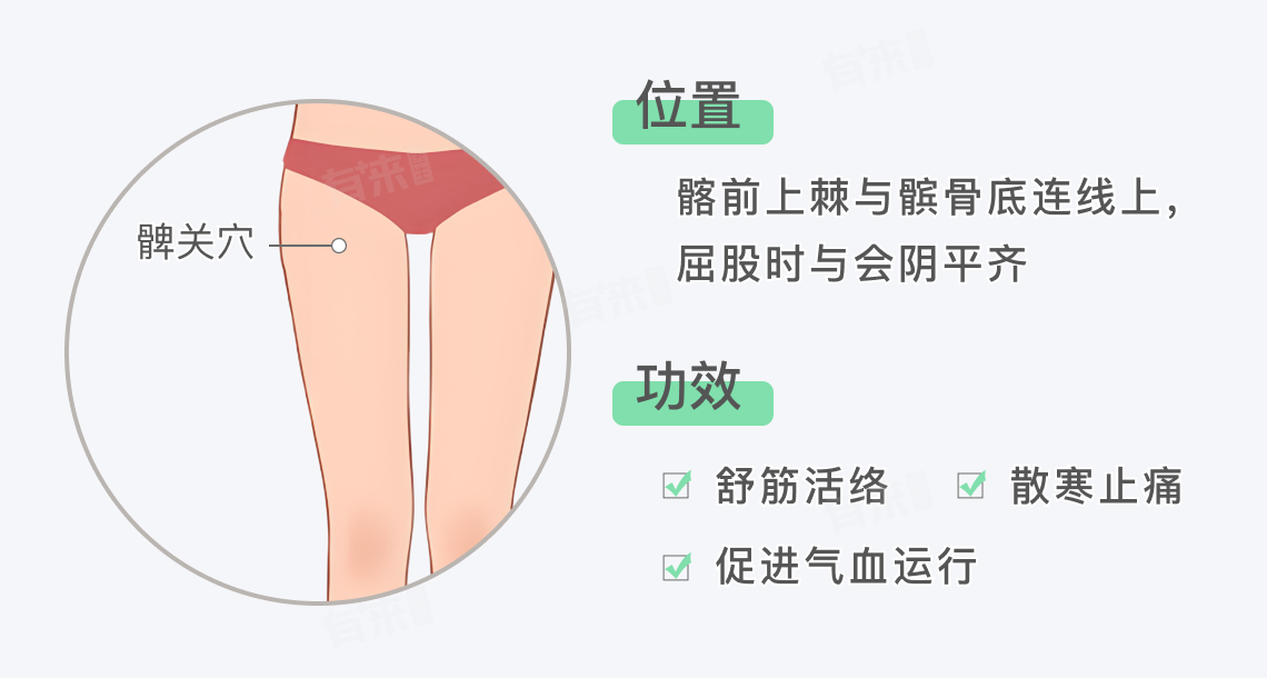 髀关穴位于大腿前外侧,屈股时平会阴处,此穴属足阳明胃经,适当按摩刺激具有舒筋活络、散寒止痛以及促进气血运行等多重功效。
