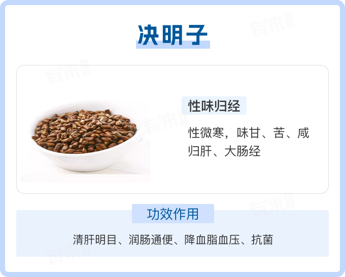决明子味甘、苦、咸,性微寒,归肝、大肠经,具有清肝明目、润肠通便、降血脂血压、抗菌等功效作用。如果需要使用中药调理身体,建议先就医辨证检查,遵医嘱使用。