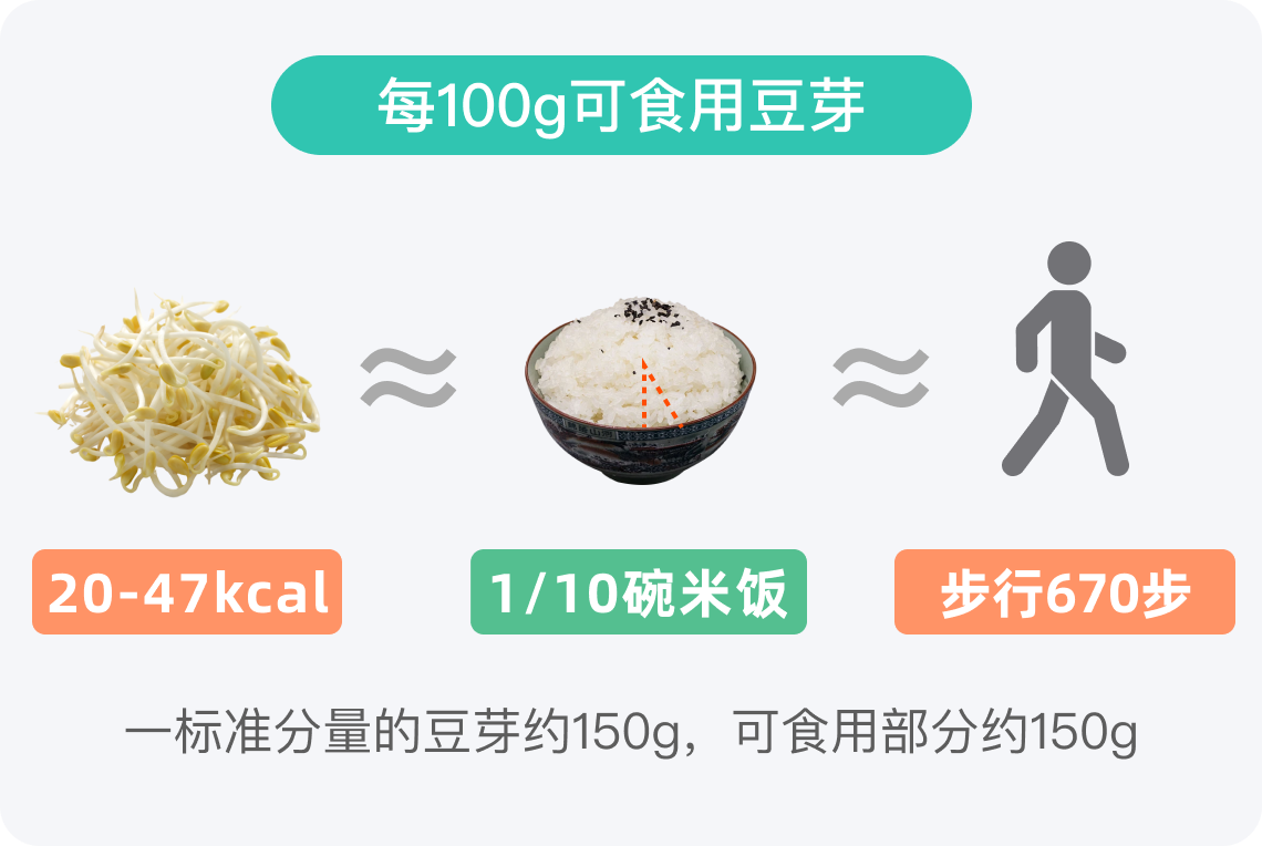 一标准分量的豆芽约150g,可食用部分克重约为150g,热量取中间值计算,约为50kcal。这一热量水平相对较低,与常见的主食相比,如米饭每100g约含116kcal热量,一碗米饭约150g,该热量仅相当于1/5碗米饭。因此,豆芽是低热量、高营养价值的食材,非常适合减肥和控制体重的人群食用。