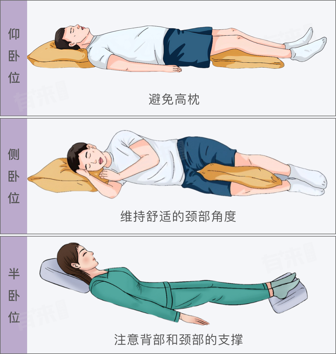 - 注意事项:头部可稍微垫高,以维持舒适的颈部角度。使用较硬的枕头支撑头部,避免头部在睡眠中不自觉转动。