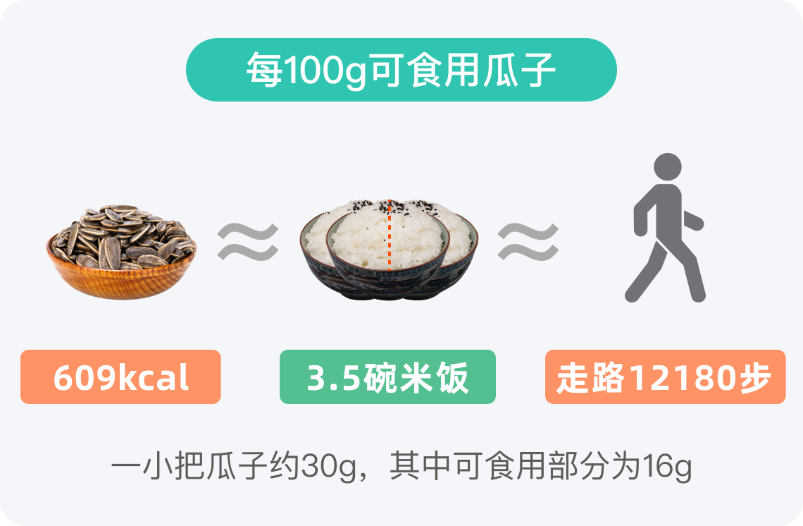 一小把瓜子约30g,其中可食用的瓜子仁部分约为16g,食用后所产生的热量为97kcal,相当于半碗米饭的热量。