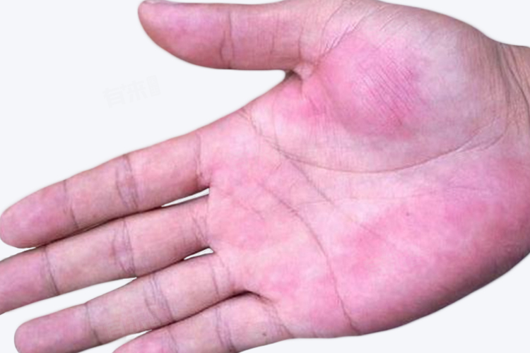 2、肝掌:表现为手掌大小鱼际处皮肤发红,加压后褪色。其发生机制与蜘蛛痣类似,也是由于体内雌激素水平升高,使手部毛细血管扩张充血。