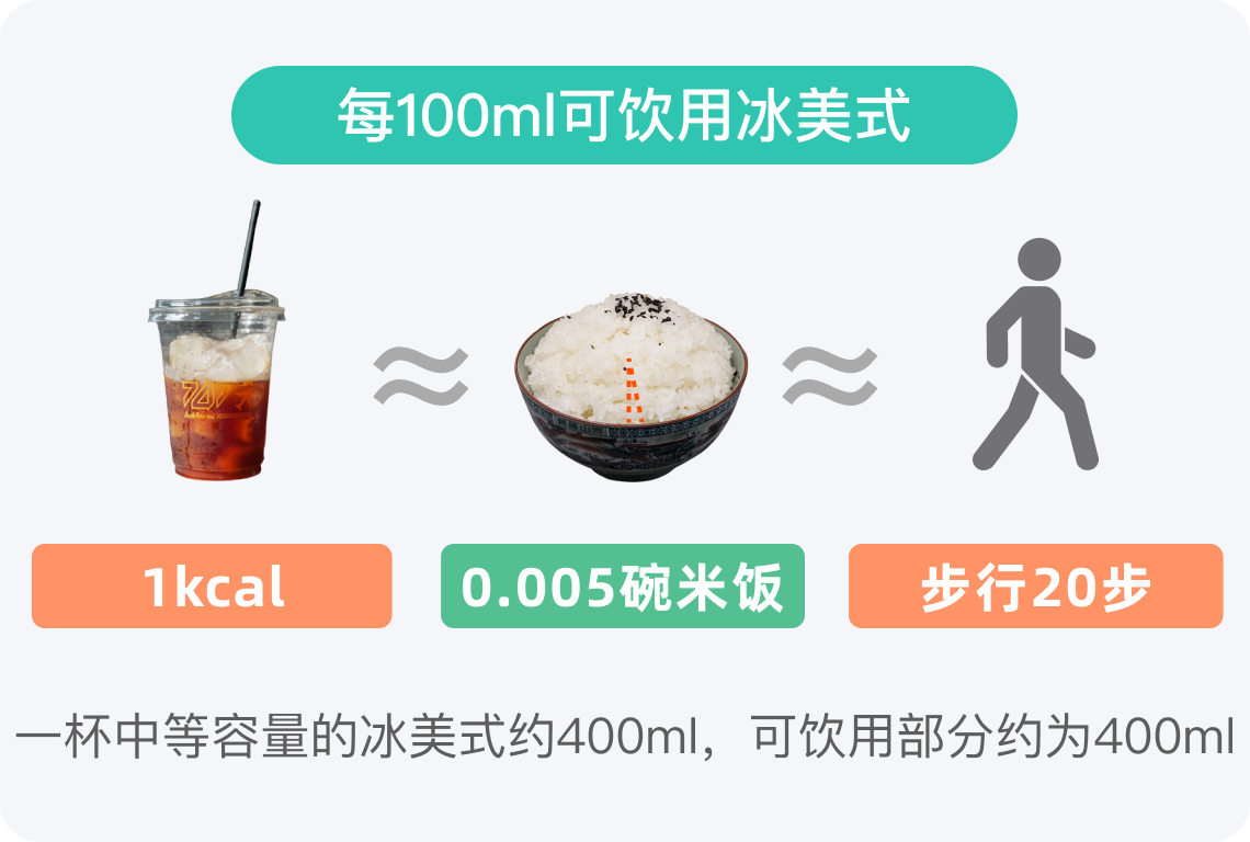 一杯中等容量的冰美式约400ml,可饮用部分约为400ml,饮用后在体内可产生热量约4kcal,大约相当于0.02碗米饭的热量。这个热量水平在普通成年人一餐中所占比例极低,几乎可以忽略不计,常常可以作为午间提神的饮品,不会给身体带来明显的热量负担。