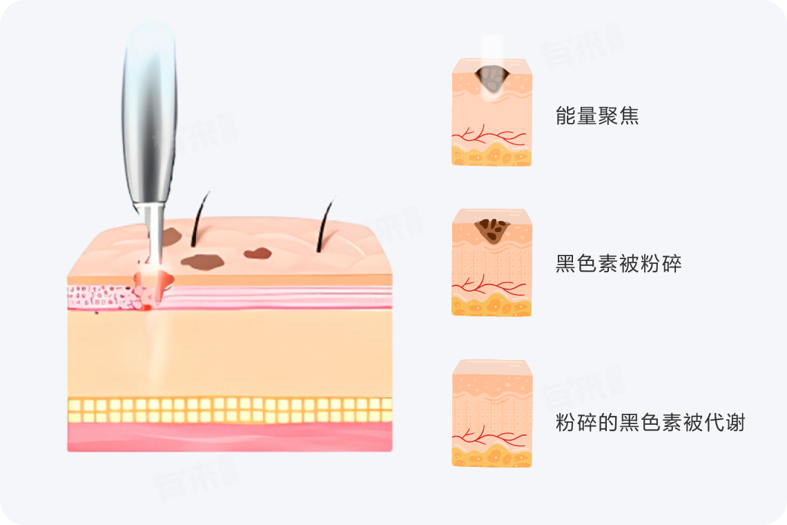 超皮秒操作过程中需要利用超短脉冲和强大的能量,可穿透至真皮层,能够改善肌肤状态,起到收缩毛孔、淡化皮下黑色素沉淀和面部斑点的作用,需要护理一段时间以帮助恢复。