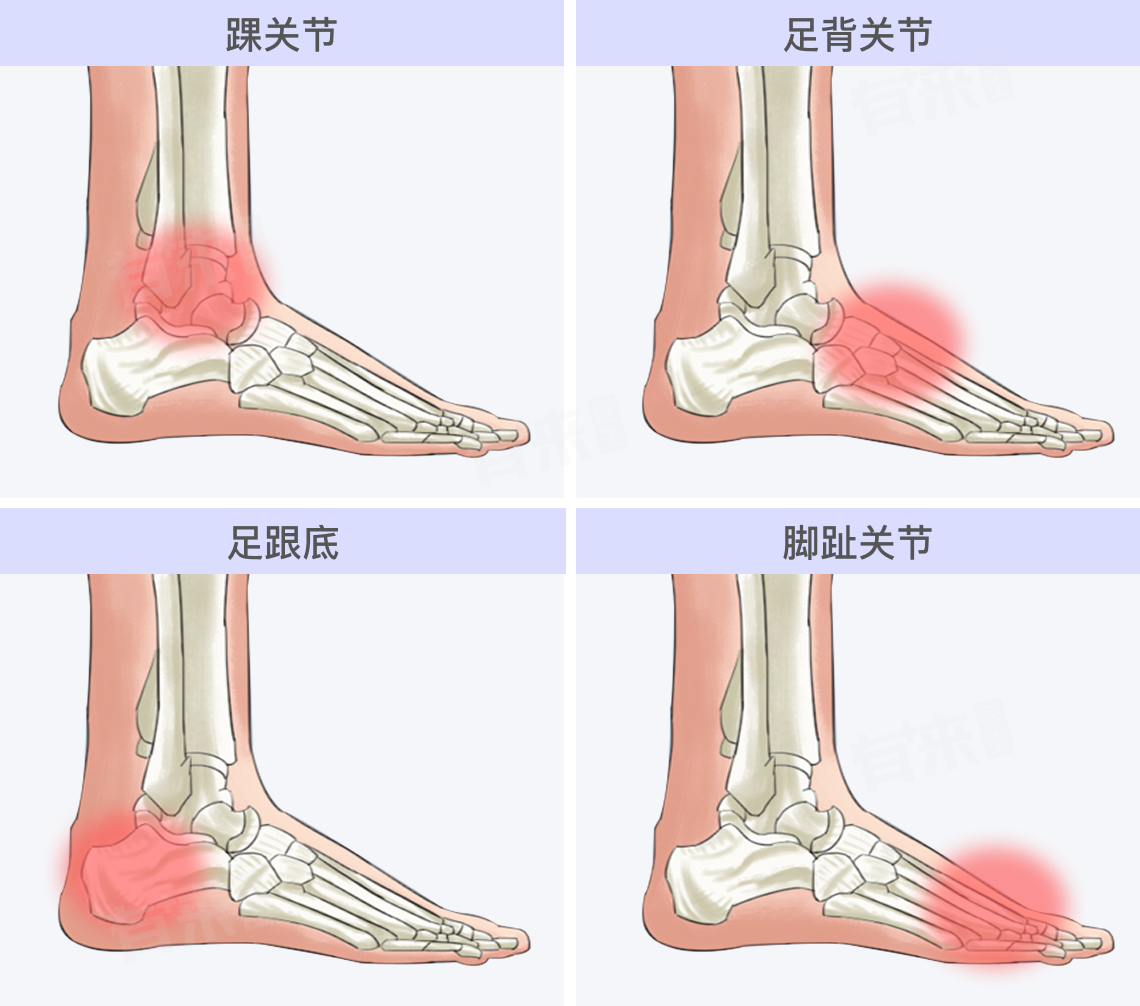 - 位置细节:这是脚痛风最常见的发作部位。位于脚的前端,是大脚趾与脚掌连接的关节部分。从解剖学角度看,这个关节由第一跖骨和近节趾骨构成,在关节的周围有滑膜、韧带和肌腱等组织。