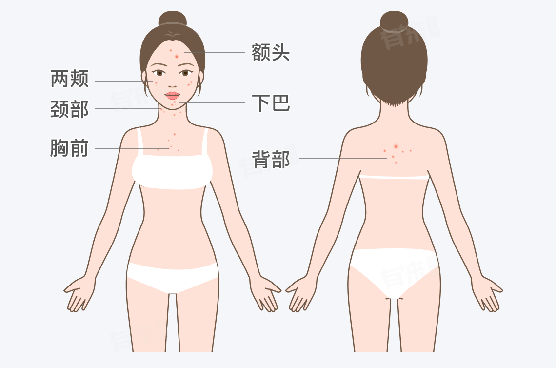 背部为膀胱经所过,胸前与心包经、肺经相关,建议及时清热解毒,祛湿排毒,有助于改善背部及胸前痘痘。湿气重且体内热毒较盛者,背部及胸前易大面积爆发痘痘。这通常伴随全身症状,如体倦乏力、小便黄赤等。
