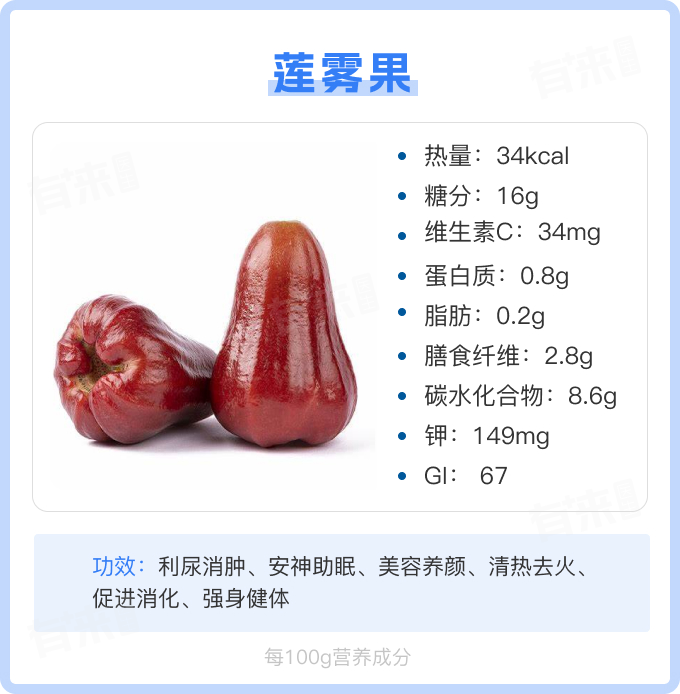 1、利尿消肿:莲雾中含有一定的钾盐,能够帮助排出多余的水分,从而起到利尿消肿的作用。同时,莲雾的含水量高达90%左右,具有显著的利尿效果。