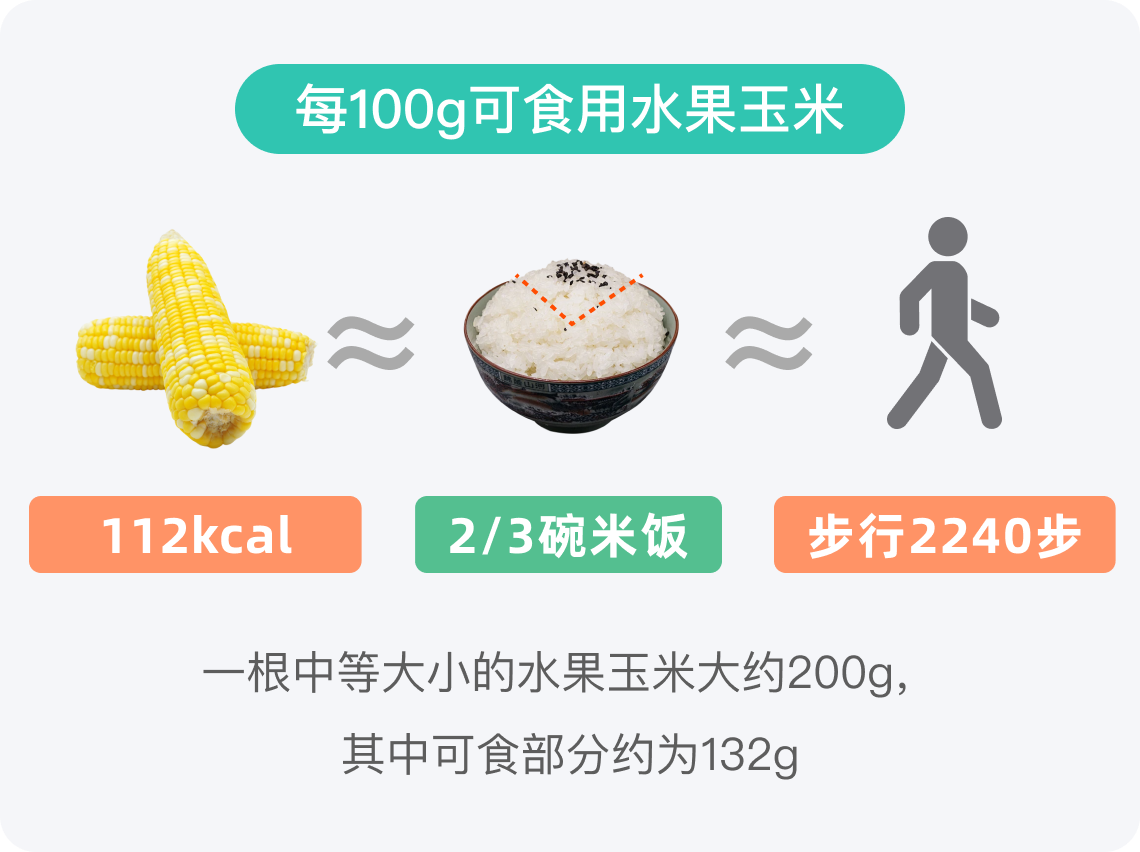 在营养学上,每100g食物热量低于100kcal的为低热量食物,100-200kcal为中热量食物,高于200kcal为高热量食物。每100g可食用水果玉米热量为112kcal,为中热量食物。一根中等大小约200g的水果玉米,其可食部分约132g,热量约148kcal,约等于6/7碗米饭。对于成年人一餐500-800kcal的热量需求而言,一根水果玉米可占一定比例。