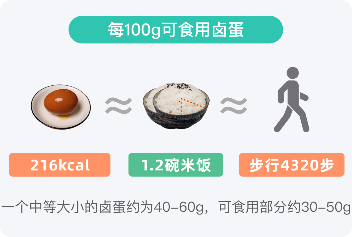 每100g热量大于200kcal即属于高热量食物,每100g可食用卤蛋的热量约为216kcal,因此卤蛋属于高热量食物。一个中等大小的卤蛋约40-60g,可食用部分约30-50g,其热量约为64.8-108kcal,相当于3/8-5/8碗米饭的热量,在成人一餐中热量占比较低。