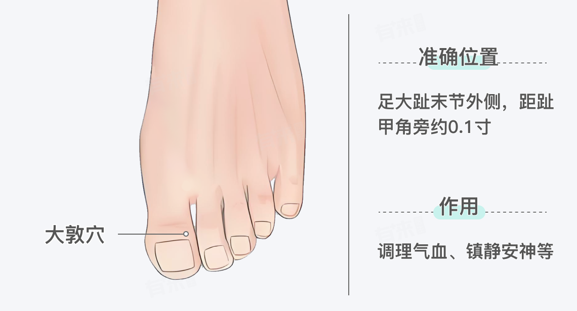 大敦是足厥阴肝经的井穴,其准确位置位于足大趾末节外侧,距趾甲角旁约0.1寸,即大约2毫米的地方,具有调理气血、镇静安神、疏肝解郁、开窍醒脑的作用。