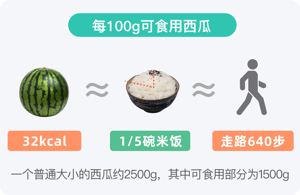 每100g西瓜的热量水平偏低,但一个5斤也就是2500g西瓜的热量水平较高,其可食用部分约1500g,热量可达480kcal,相当于2.8碗米饭的热量,因此不建议一次进食过多西瓜。