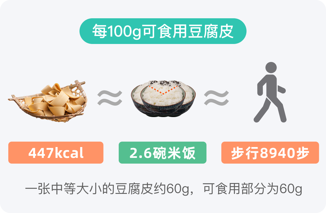 每100g豆腐皮含有447kcal热量,一张中等大小的豆腐皮可食用部分约为60g,其热量大约为268kcal,相当于1.5碗米饭的热量,这一热量值在成人一餐中的占比为25%-30%。