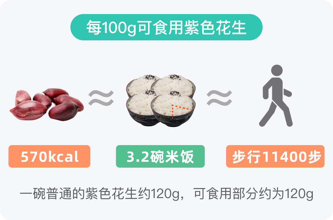 一普通饭碗的紫色花生约120g,可食用部分约120g,热量约为684kcal。与常见的米饭相比,每100g米饭的热量约为116kcal,因此一小碗紫色花生的热量,约为4碗米饭的热量。这意味着,紫色花生是一种高能量食物,适量食用可以迅速补充身体所需的能量。