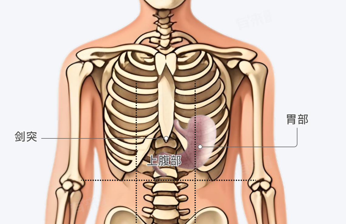 即胸骨下端软骨的位置,胃癌病变侵犯食道、膈肌等部位的神经后,可能导致该部位出现疼痛,可能表现为钝痛、隐痛或不适感,有时可能向胸骨后或上腹部放射。