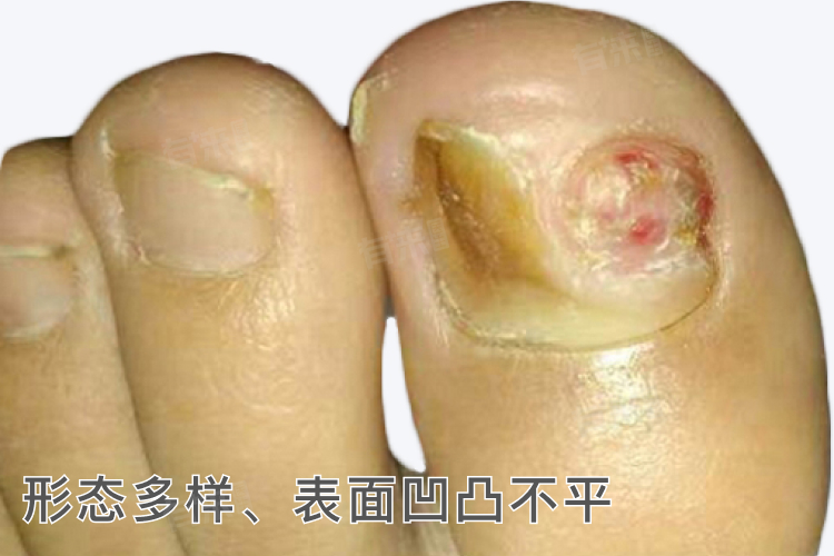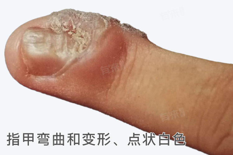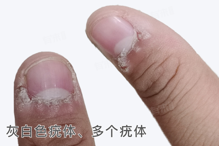 3、与指甲的关系:由于疣体位于指甲周围,可能会挤压指甲,导致指甲生长方向改变,出现弯曲、变形的情况,疣体还可能蔓延至指甲表面,表现为白色或灰白色的点状或条状隆起,与正常指甲组织界限清晰。