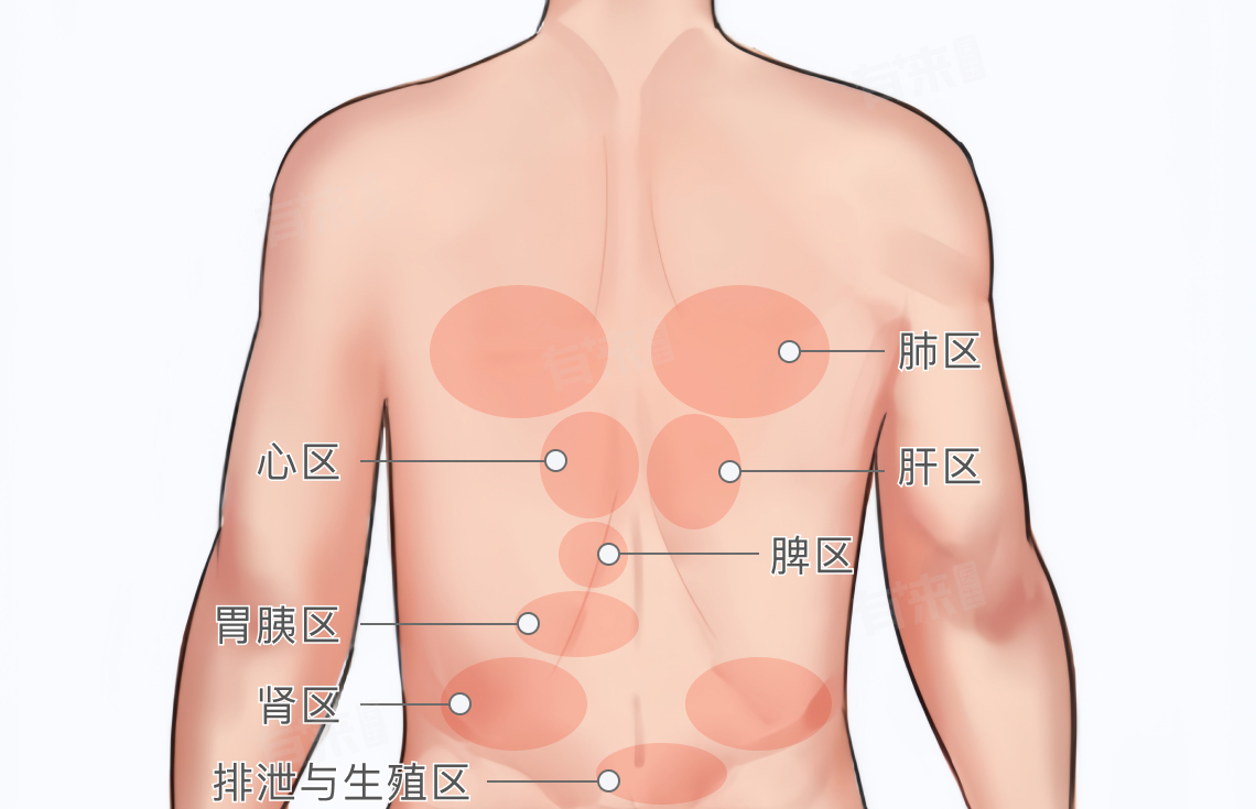 按照中医理论,人体背部存在与内脏器官相关的反射区,这些反射区可以通过按摩或刺激影响对应内脏器官的功能和健康。背部常见的7个反射区包括肺区、心区、肝区、脾区、肾区、胃胰区、排泄与生殖区,具体位置如下: