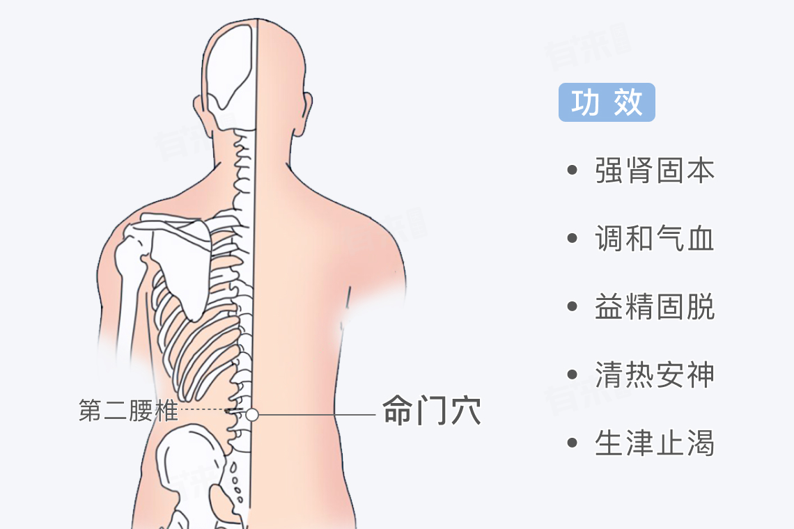 命门穴为督脉腧穴名,位于第二腰椎棘突下,后正中线上。由专业人士正确刺激命门穴有强肾固本、调和气血、益精固脱、清热安神、生津止渴等功效。