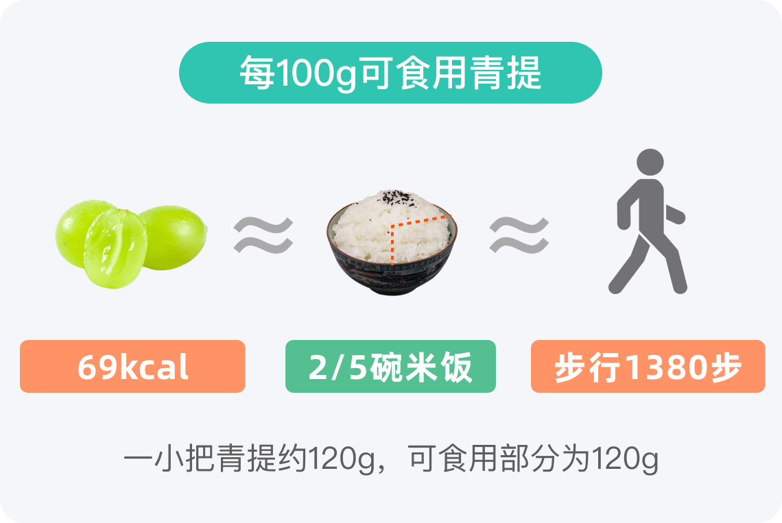 每100g青提的热量约为69kcal,一小把青提(可食用部分约120g)的热量大约为83kcal,相当于半碗米饭的热量。在成人的日常饮食中,一小把青提提供的热量约占一餐总热量的5%至10%,具体比例取决于个人的整体热量需求。