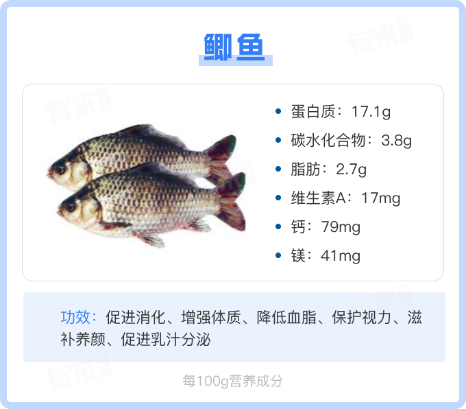 - 滋补养颜:鲫鱼具有补中益气、健脾和胃等功效,对于女性来说还有美容养颜的作用。适量食用鲫鱼可以改善皮肤状态,增加皮肤弹性。