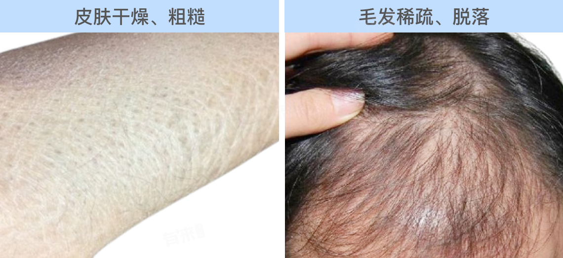 - 毛发稀疏脱落:毛发的生长也需要甲状腺激素的支持,甲减患者可能会出现头发稀疏、易脱落的情况,眉毛外侧也可能会稀疏。