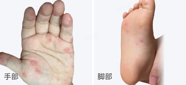通常出现在手心、足底、臀部等部位,有时也可能蔓延到躯干、四肢、膝盖、肘部以及肛周,皮疹起初可能是红色的丘疹,随后转变为疱疹,疱疹周围有红晕,疱内液体较少。一般不痛不痒,但会影响患儿的外观和舒适度。皮疹消退后不留瘢痕或色素沉着。