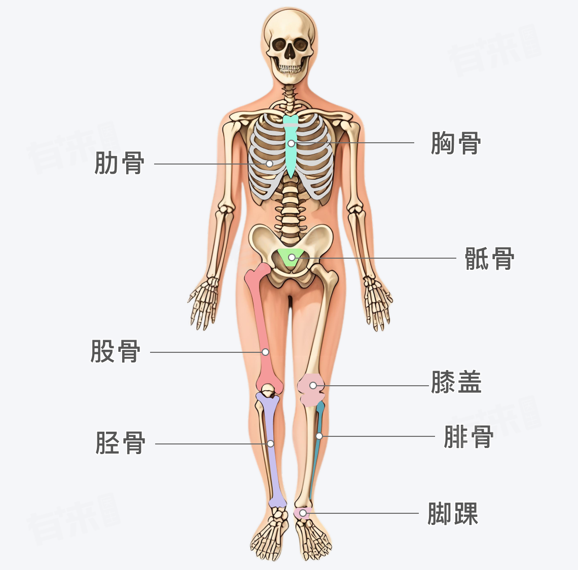 - 位置:包括大腿骨(股骨)、小腿骨(胫骨和腓骨)、膝盖、脚踝等部位的疼痛。