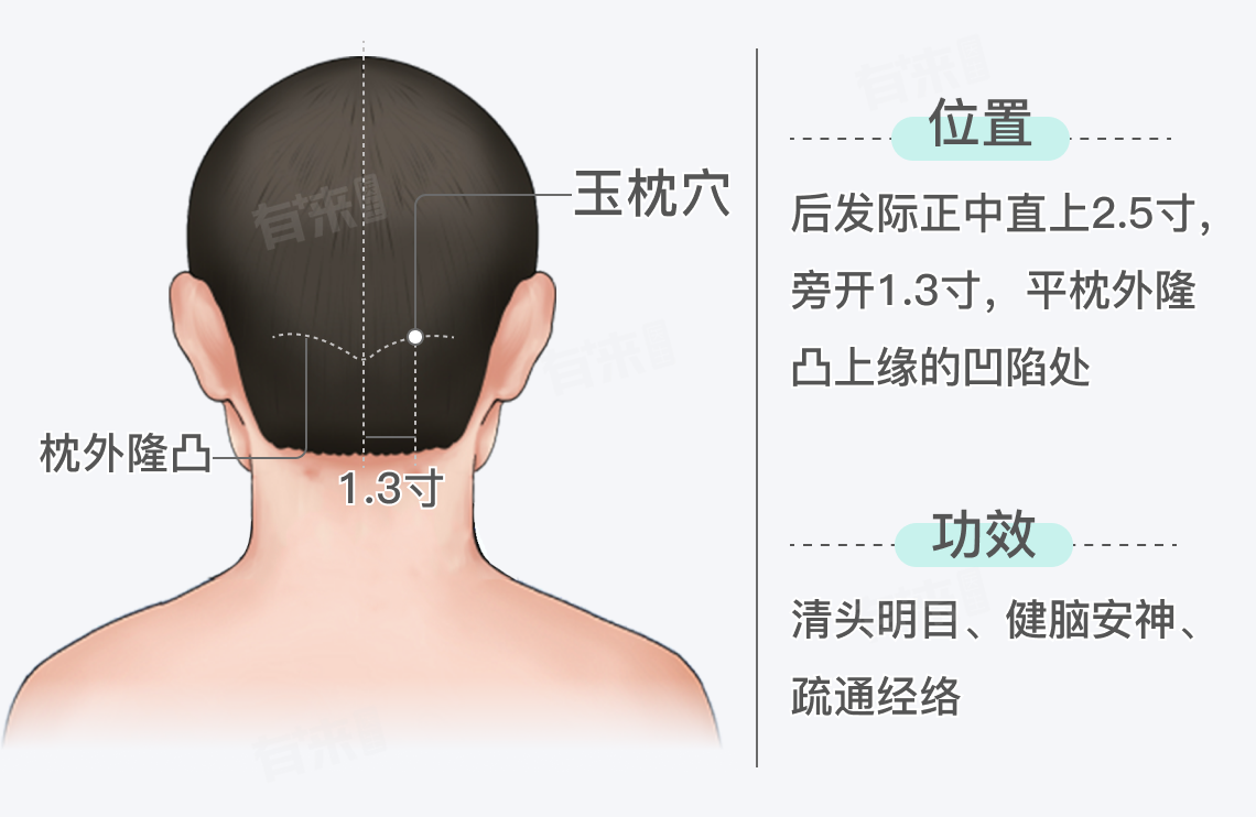 1、清头明目:玉枕穴位于头部,和眼睛的关系密切,从经络循行角度看,膀胱经与眼睛相连,刺激玉枕穴可以疏通膀胱经的气血,起到清利头目、改善视力的作用。