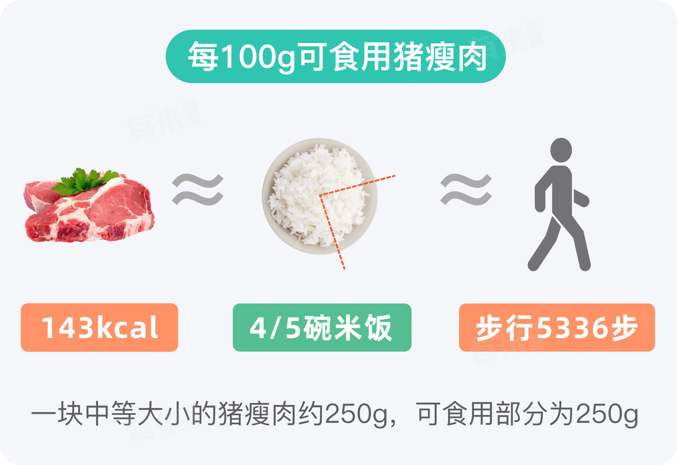 每100g猪瘦肉的热量转化为日常饮食中的米饭量,大致相当于4/5碗米饭(以每碗米饭约150g、热量约174kcal计算)。当然,具体转化比例还受到米饭种类、烹饪方式等因素的影响。从运动消耗的角度来看,消耗掉100g猪瘦肉的热量,大约需要走路5336步。具体时间因个人体重、运动强度等因素而异,但可作为基本参考。